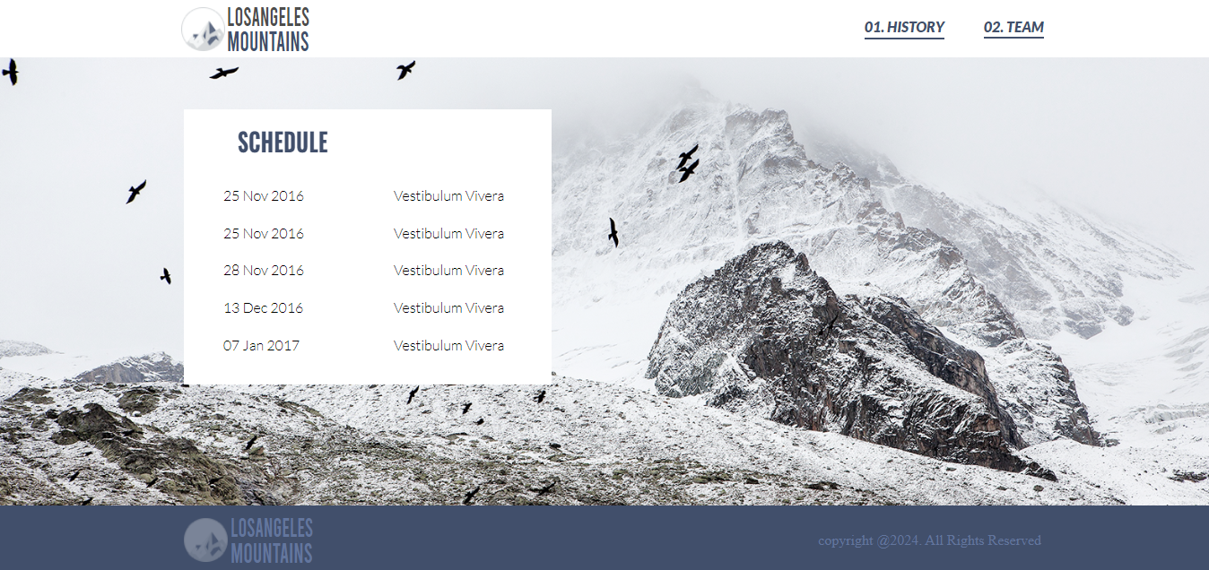 LosAngeles Mountains is a one-page website template built to feature some of the most awesome mountain sites in Los Angeles, and to feature shedules for people interested in mountain climbing activities.