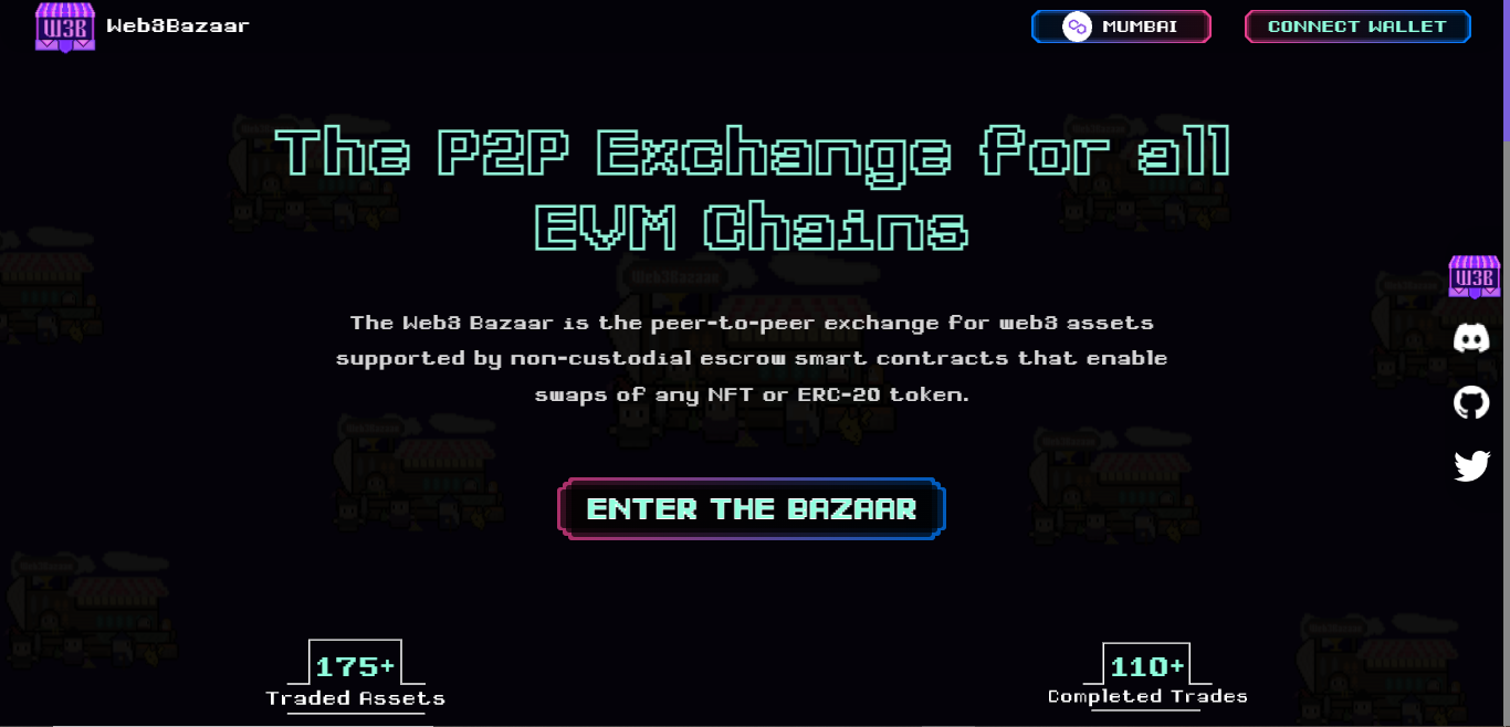 The Web 3 Bazaar is a relaible P2P exchange platform for web 3 assets. They do so by the use of non-custodial escrow smart contracts, making it quick, secure and permisionless.